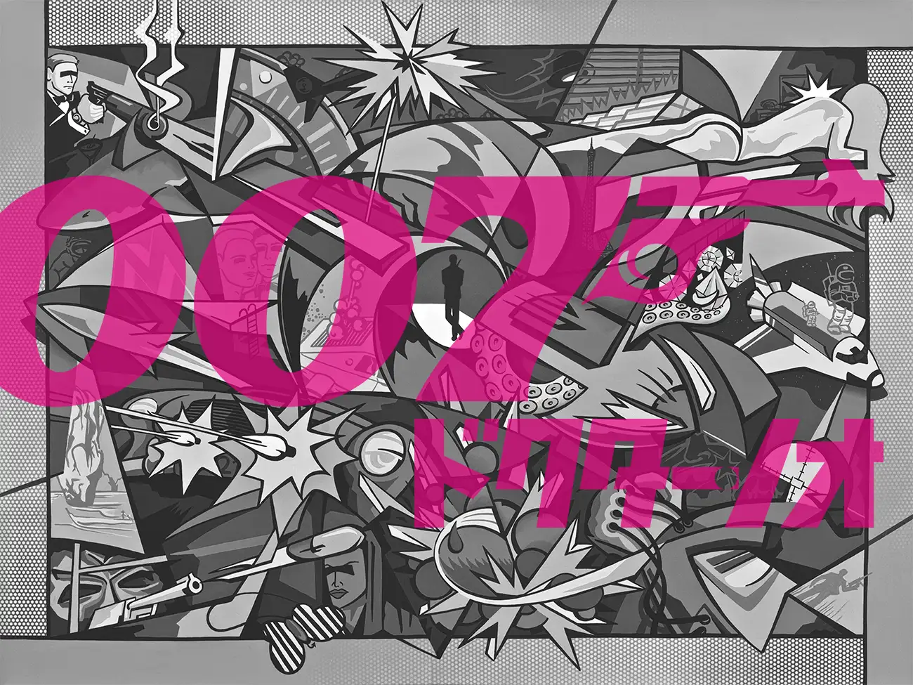 This dynamic artwork captures the essence of James Bond’s cinematic legacy through a bold, pop-art-inspired composition. Rendered in grayscale with striking pink typography, the piece layers iconic Bond imagery—guns, explosions, villains, and espionage—into a fragmented, high-energy collage.