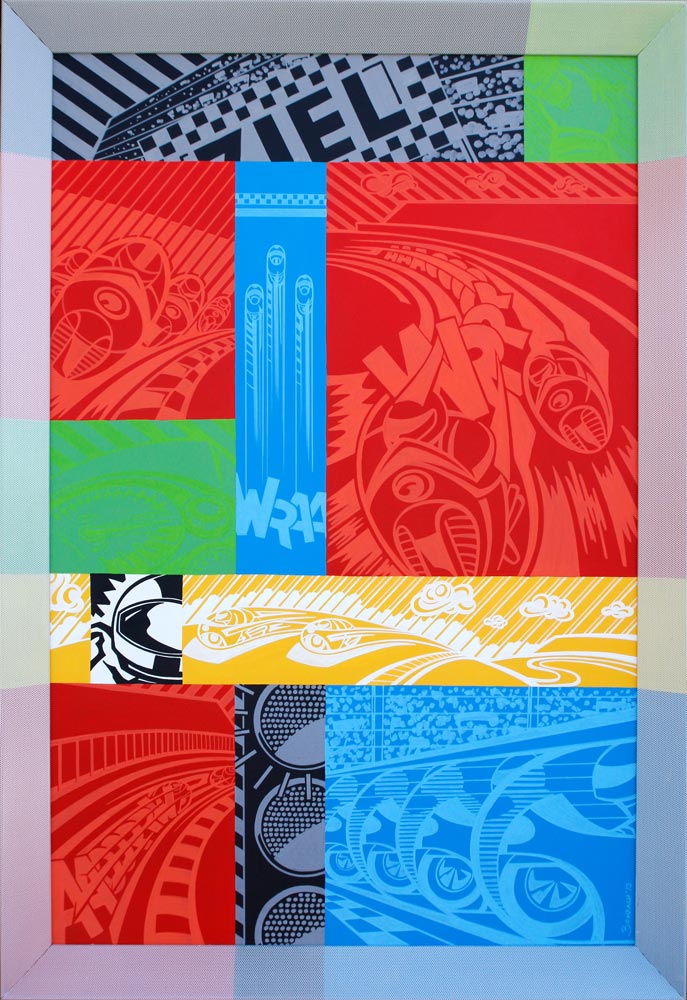 In this piece, I wanted to capture the raw energy and exhilaration of high-speed racing. The composition is fragmented, much like fleeting moments on the track—glimpses of speed, competition, and motion colliding in a single frame. Bold geometric divisions and a vivid color palette create rhythm and controlled chaos, reflecting the adrenaline-fueled intensity of the race.
